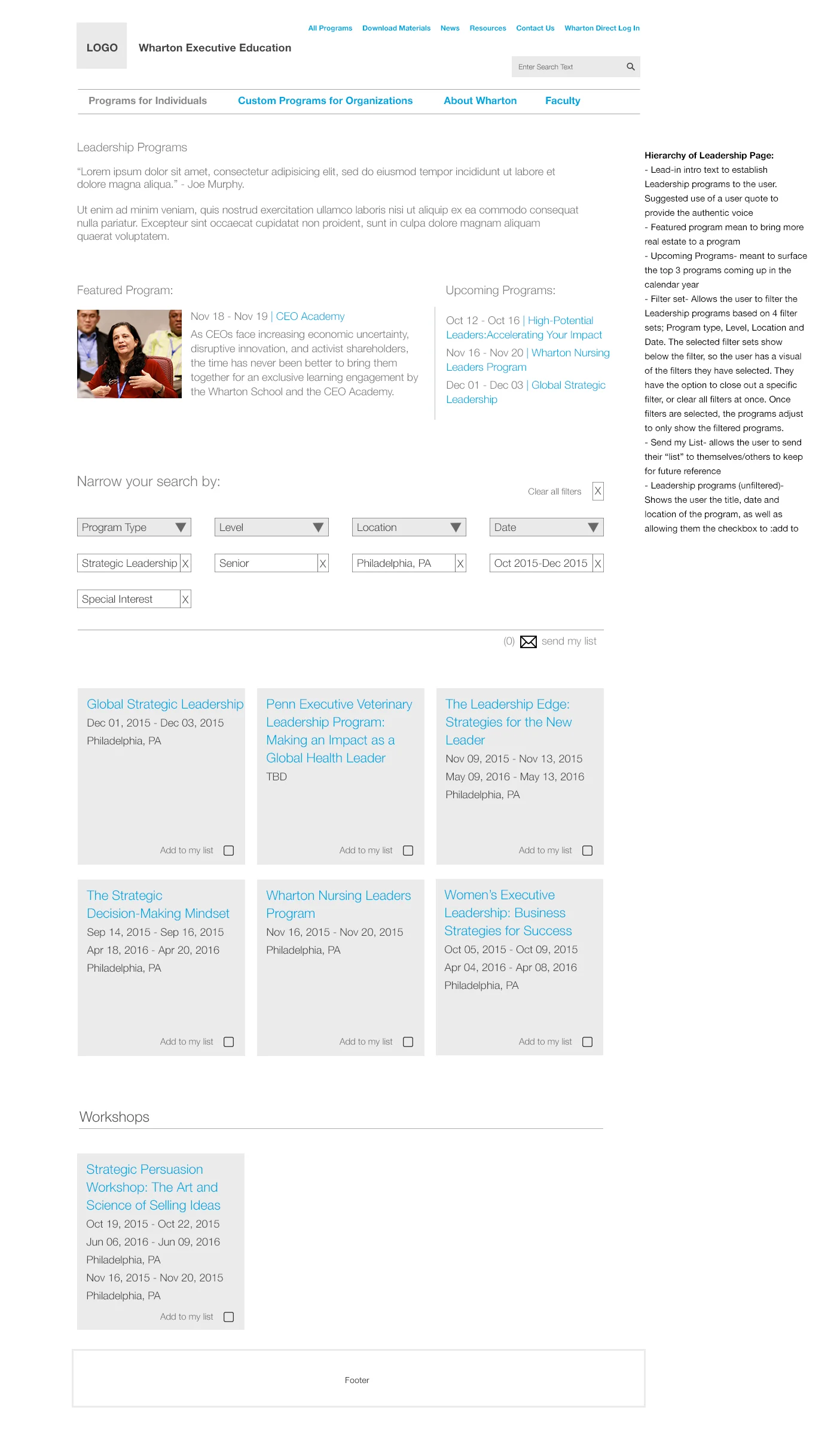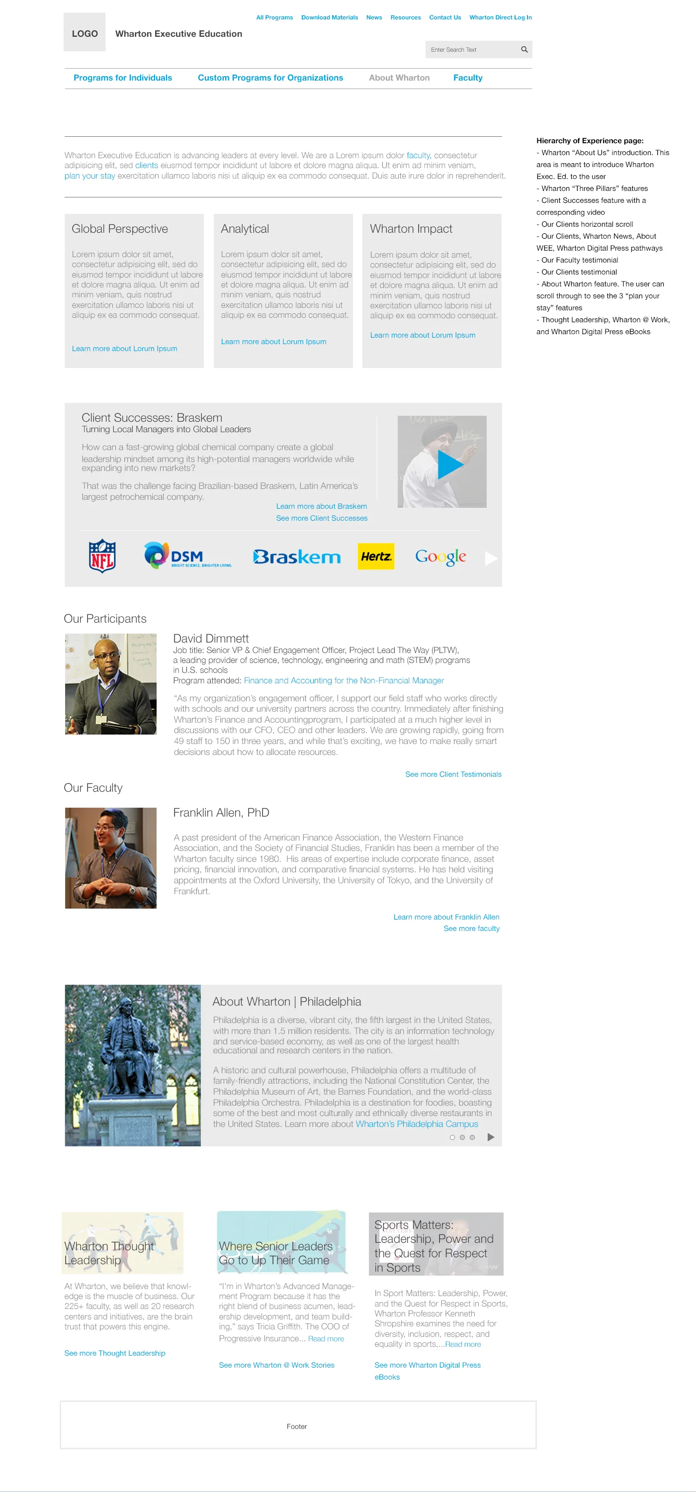 Sticking with the theme of Higher Education, I had the pleasure of working for Wharton Executive Education's redesign of their site. I came onto the project with the sitemap and homepage designs already completed, so I dove right in and began designing some interior pages. We wanted to feature some programs the user may not have heard of, along with Wharton's featured programs. We tried to get a nice balance between image, video and text on the pages, while always keeping in mind the main goal is to drive users to apply!