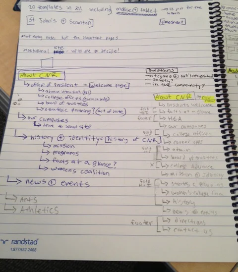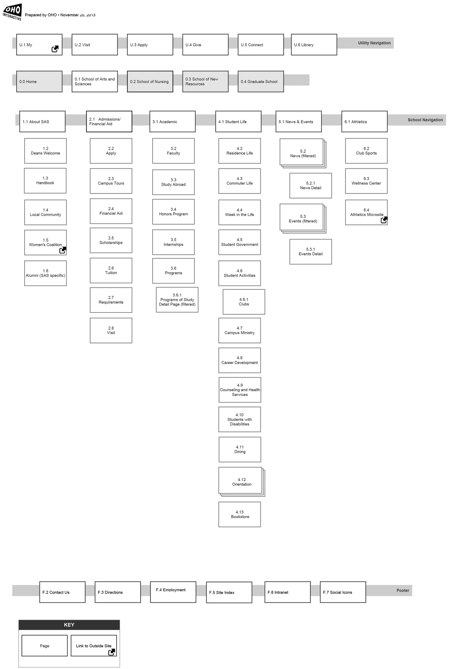 This was my main project when I worked for OHO Interactive. I was tasked with redesigning the College of New Rochelle's website. We started by interviewing users. We had about 15 students from the undergraduate, 20 from graduate, and we sprinkled in a few interviews with faculty and staff as well. From there we gathered all the research and created the sitemap based on what users were looking for and where. It's important to note that I did all of my designing for this project in Axure, which I was also teaching myself! It's a great took to create prototypes! Once the sitemaps were approved (we created mini sites for each school, so we created a sitemap per school) we moved into design.